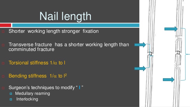 IM nail은 당연히 직경이 클수록 안정성이 높아집니다. (4제곱) 뼈와 만나는 부분이 많을 수록 안정성이 높으며 나사가 골절사이와의 길이가 짧을 수록 stiffness 가 강합니다. (bending 은 제곱에 반비례, torsion 은 반비례)
