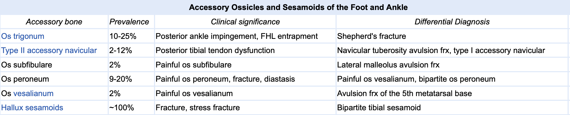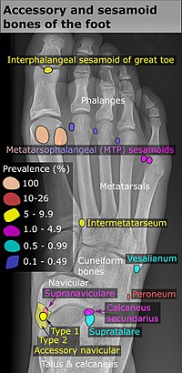 족부에만 40개 넘는 부골이 생길 수 있습니다. 부골이란 것은 대부분 2차 골화중심이 유합되지 못한 채 유지되는 상태로 성장이 끝나게 되면 다음과 같은 작은 형태의 뼈 모양으로 남게 됩니다.