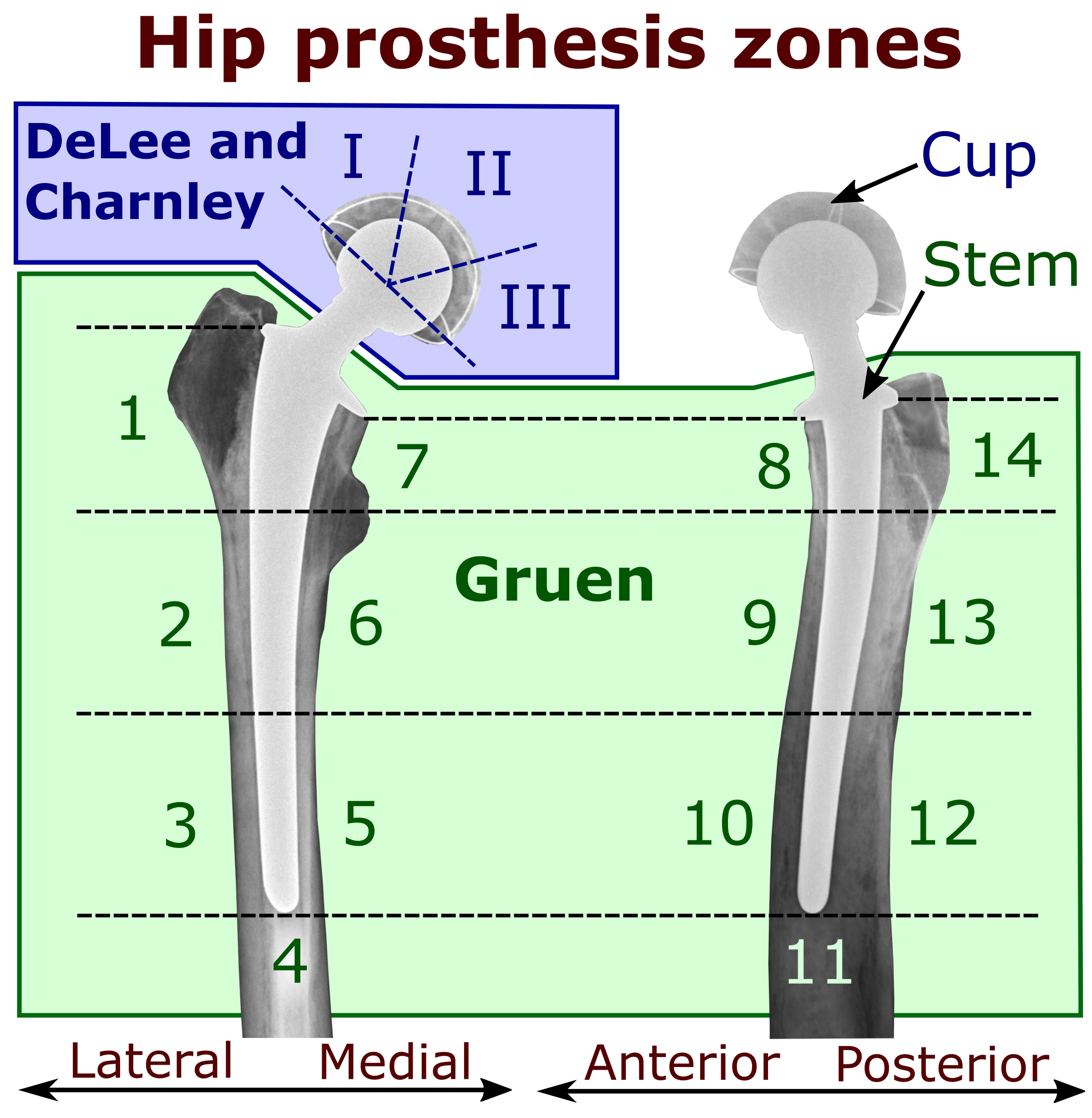 대퇴부는 AP에서 바깥쪽으로 부터 1~7 까지, lat에서 앞쪽부터 8~14로 구역을 나눕니다. (Gruen)
