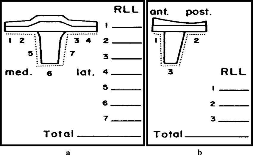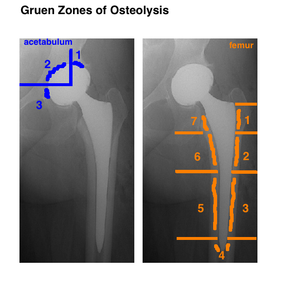 대퇴부는 AP에서 바깥쪽으로 부터 1~7 까지, lat에서 앞쪽부터 8~14로 구역을 나눕니다. (Gruen)