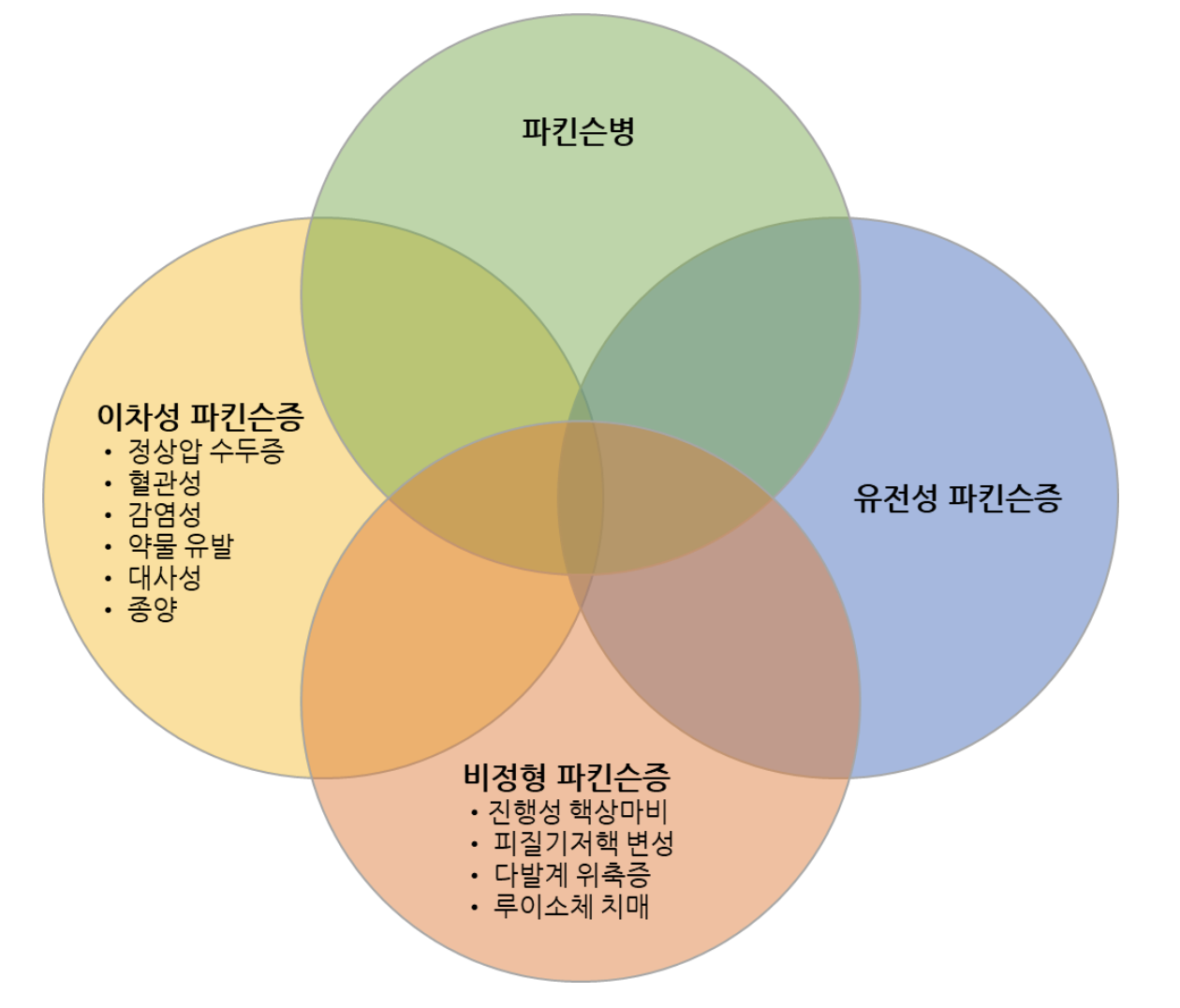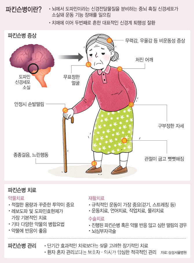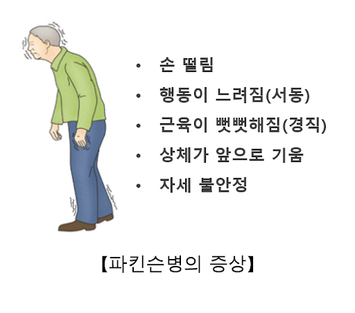 간단하게 설명하면, 중뇌에 존재하는 도파민성 신경세포가 사멸하면서 여러가지 증상이 생기게 되는 질환입니다. 세포가 60~80% 정도 사멸했을 때 증상이 나타나므로, 치매와 같이 점진적으로 진행하는 경우가 많습니다. 50대 이하에서도 발병하는 경우도 있습니다. 점진적이다 보니, 나중에는 보행이 불가능하게 되며 일상생활을 할 수 없습니다.