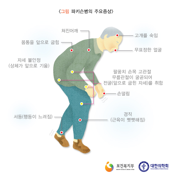 한국어로 더 쉽게 특징적인 증상을 요약하면 3대 증상으로 : 몸의 움직임이 비정상적으로 느려지는 서동, 손이나 발이 떨리는 진전, 근육과 관절운동이 뻣뻣해지는 경직으로 볼 수 있습니다. 초기 증상이 있을 때는 관절염 등이나 경추병 등으로 진단할 수 있으니 병의 진행을 잘 관찰해야합니다. 이 외에도 비특이적인 다른 증상이 함께 나타날 수 있습니다.