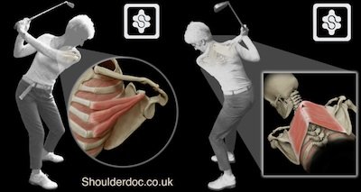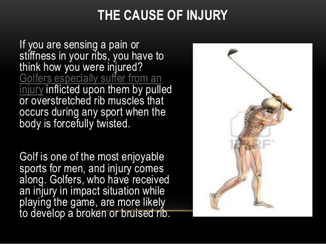 견갑골과 갈비뼈를 이어주는 Serratus anterior muscle 과 Rhomboid 안쪽 근육, Scapula 의 움직임 등으로 Rib cage 가 영향을 받을 수 있습니다. 행군을 많이하는 군인에게서 발목에 골절이 생기는 원리와 같습니다. 주로 나이가 든 분이나 여성에서는 앞쪽이나 근육 부착부위의 갈비뼈(4-9th)에 골절이 생기며, 남성에서 과하게 스윙 후 finish 를 하는 경우에는 좌측 견갑골과 갈비뼈의 충돌로 좌측 등쪽의 갈비뼈에 골절이 생깁니다. 프로 골퍼의 연습량이 늘었을때나, 주로 초보 골퍼에게서 후방 안쪽의 골절이 생깁니다.