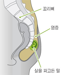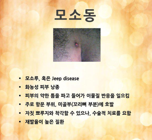 꼬리뼈가 닫는 부분에 모낭이 막히면서 구멍이 생기는 '모소동' 같은 병변 은 심한 경우 척추감염으로 까지 진행될 수 있습니다. 따라서 치료는 항생제와 pus drainage 로 간단하긴 하지만, 의사의 진료와 치료가 꼭 필요한 진단 중에 하나 입니다.
