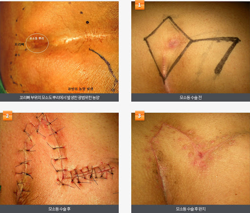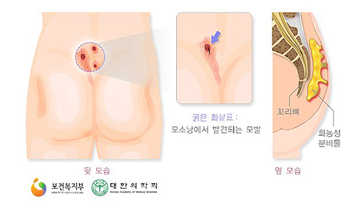 꼭 감별해야 될 모소동 과 수술후 상태 (주로 관을 넣어 고름을 배액시킵니다.)