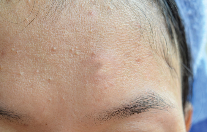 쉽게 대표적으로 보이는 편평사마귀와 좁쌀 여드름의 구분하는 방법은 편평한 융기가 있는지 확인하는 것 입니다.