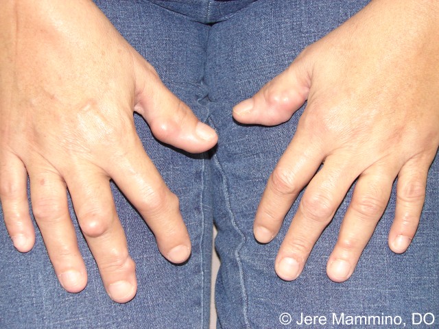 3) 손 관절의 관절염: 손목, 손가락 중간마디 관절, 손바닥 관절 중 한 관절 이상의 종창