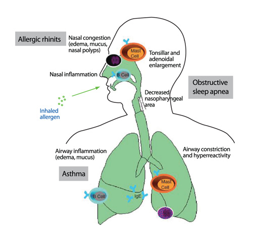 우리 몸 외부의 항원(작은 가루) 들이 우리 몸에 들어오게 되면 이 작은 알갱이들을 내보내기 위해 우리몸은 전투태세에 돌입합니다. 비만 세포에서는 히스타민 이라는 물질을 내보내며 전신적인 알레르기 반응을 일으킵니다. 일시적인 천식이나 일시적인 아토피라고 볼 수도 있겠습니다.