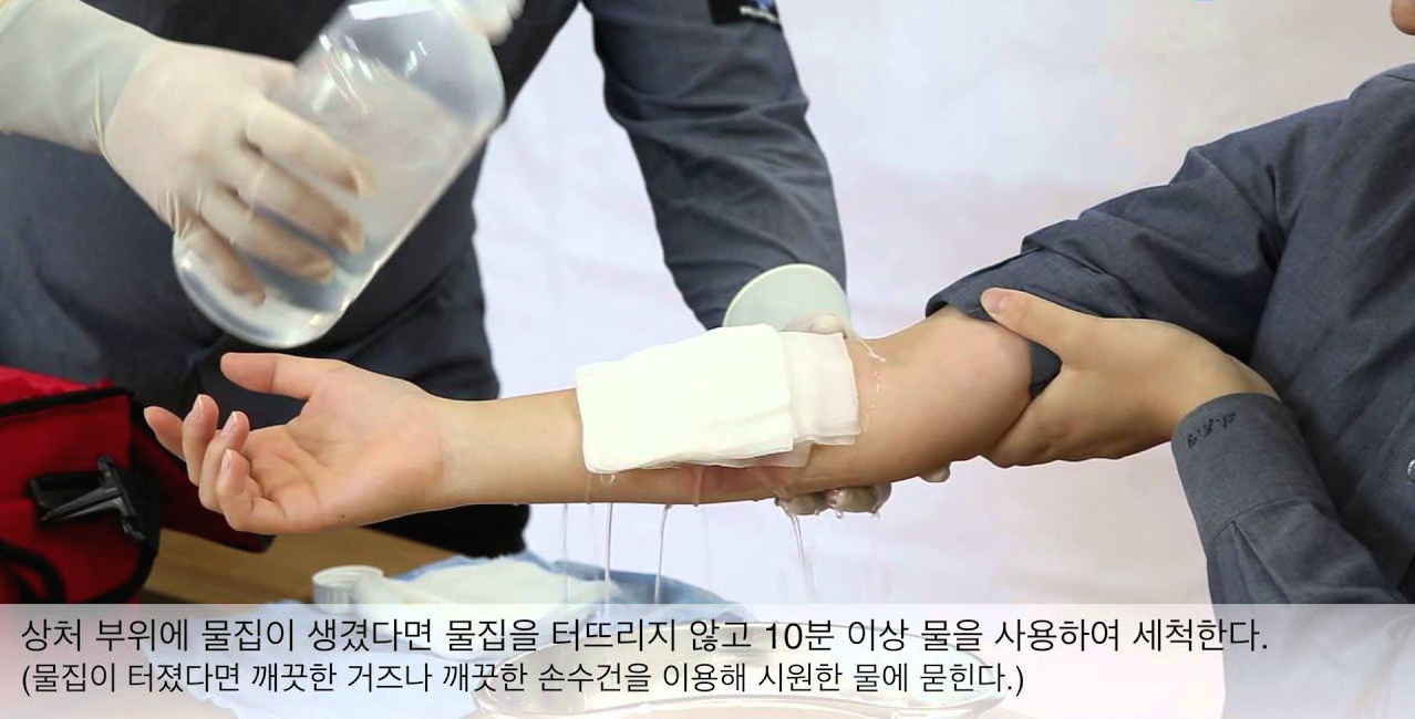 초기 상처부분에 미지근한물 을 이용해서 멸균된 거즈 (없으면 수건이나 천) 등을 통해 화상부위에 추가감염이 없도록 하고