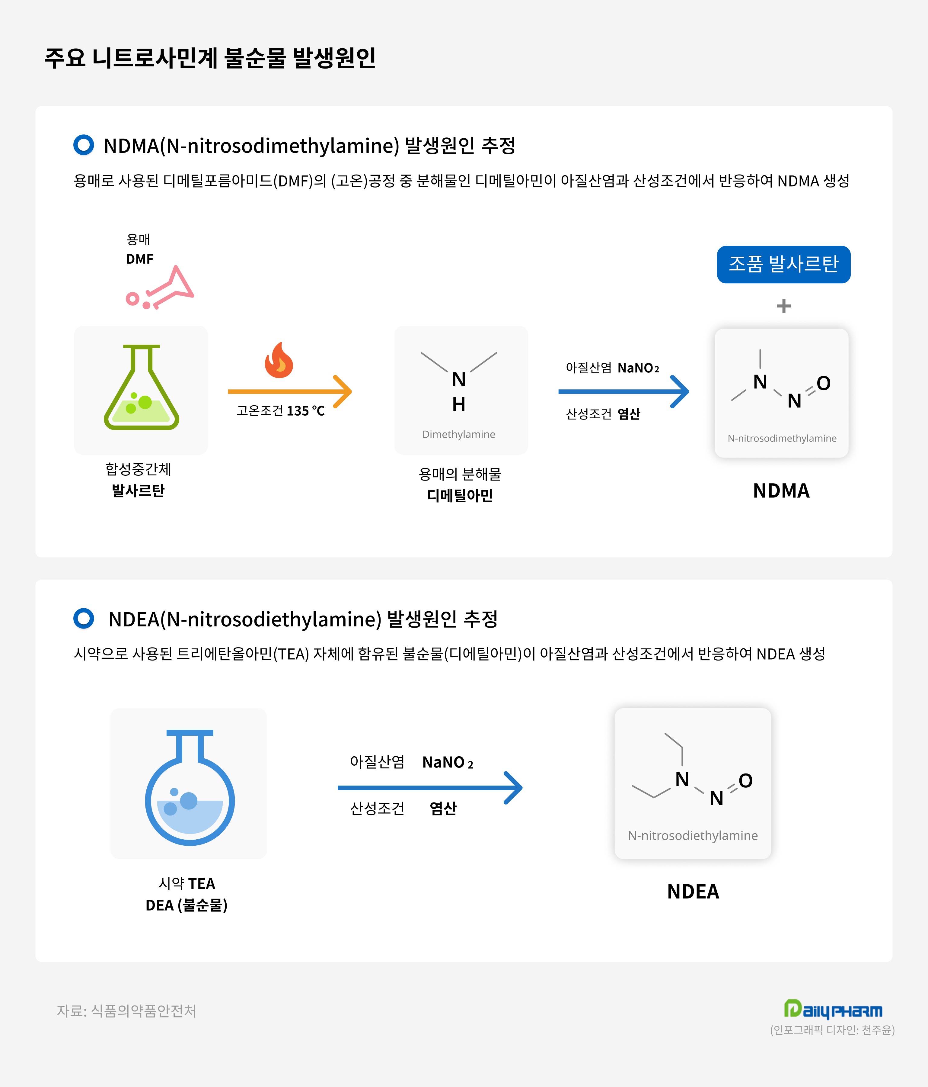 약을 만들때 고온 같은 조건에서 바로 이 고리를 가지고 있는 화학구조의 혈압제의 경우 공정 중에 NDMA, NDEA 와 같은 발암물질이 생길 수 있다는 것 입니다. 사실 발암을 일으키는지는 대규모 코호트 연구를 해야하기 때문에 쉽지 않습니다.
