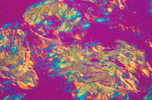 요산 결정은 위와 같이 생겼고 이러한 결정이 관절에 침착되었을 때 심한 통증을 일으키게 됩니다.