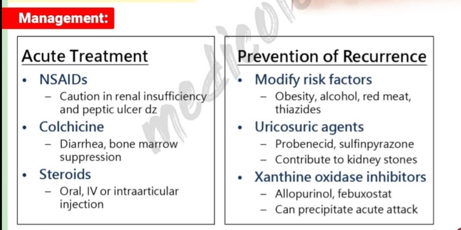 따라서 가장먼저 해야할 치료는 '통증조절' 입니다. 흔하게 NSAID(indomethacin), colchicine(재발때도 방지용으로 사용) 등을 이용합니다.(둘다 사용 못하는 경우는 IV steroid도 고려)