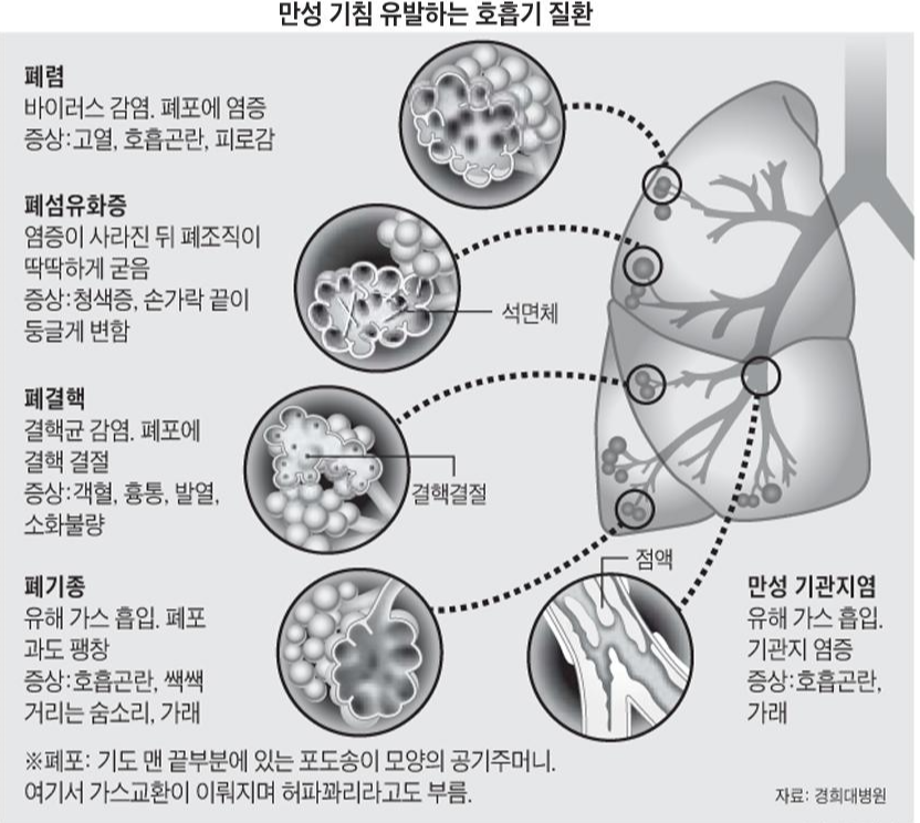 기침이 만성적으로 변했다고 생각이 되면 아래와 같은 질환들과 감별이 꼭 필요합니다.