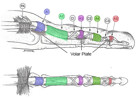 쉽게 문제가 생기게되는 것은 굽힘근과, 폄근의 gliding 움직임을 방해하게 되어 생기게 되는데, 주로 A1 이라고 불리는 부분에서 점진적인 통증과 클릭소리, 잡히는 움직임, 손가락 걸림 이 생기게 됩니다.