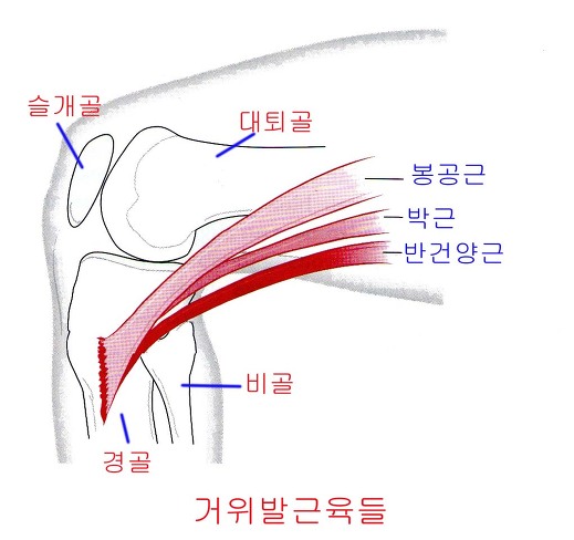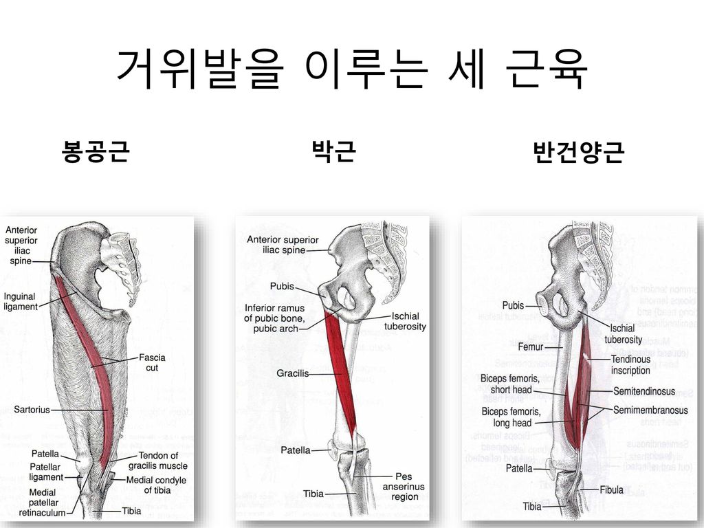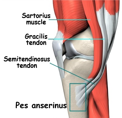 세 가닥의 붙어있는 근육들이 모두 한 부분에 붙어있기 때문이죠. 증상을 보면 근육의 중간에서보다 골 부착부위에서 자극을 더 쉽게 받고 염증을 쉽게 느끼는 것 같습니다. 마치 거위 발처럼 세가지의 근육이 엉켜 있다고 해서 "Pes Anserinus"라고 불립니다. 이러한 근육들은 대게 슬관절의 굽힘 운동과 내전 운동과 관련이 많습니다.