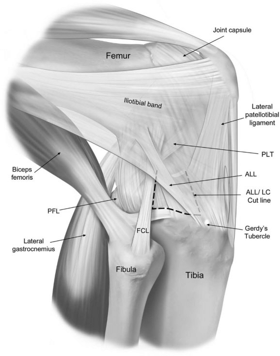 외측인대는 앞측 비골 근위부와 원위 대퇴골(lateral epicondyle) 사이에 붙어있습니다.