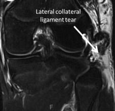 젊고 운동하는 환자분들 중에 생길 수 있는 무릎 외측 인대 손상 입니다. 무릎안쪽에서 바깥쪽으로의 외력이 작용하는 것을 VARUS STRESS 라고 하는데, 이러한 과도한 VARUS STRESS 가 짧은 순간에 가해진 경우 이런 바깥쪽 인대의 손상이 있을 수 있습니다.