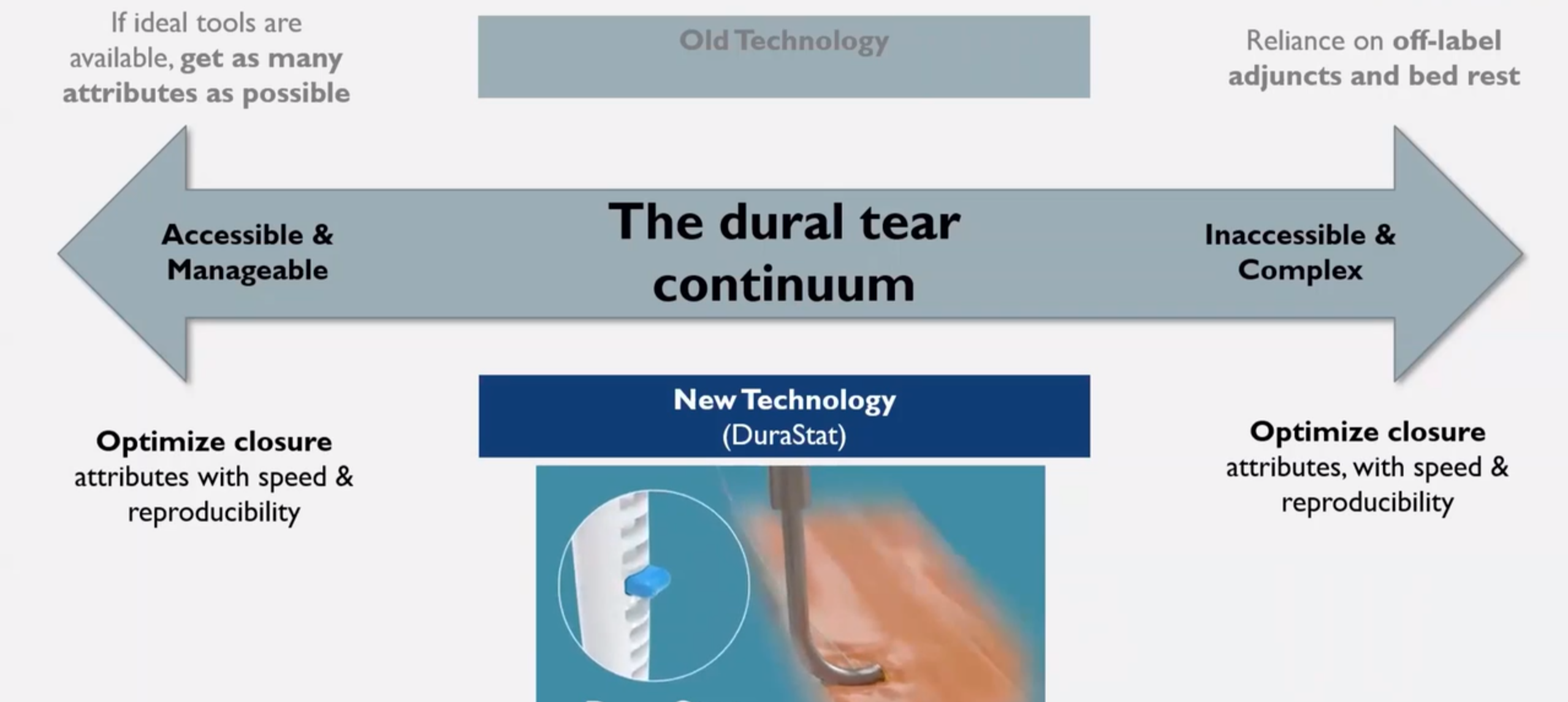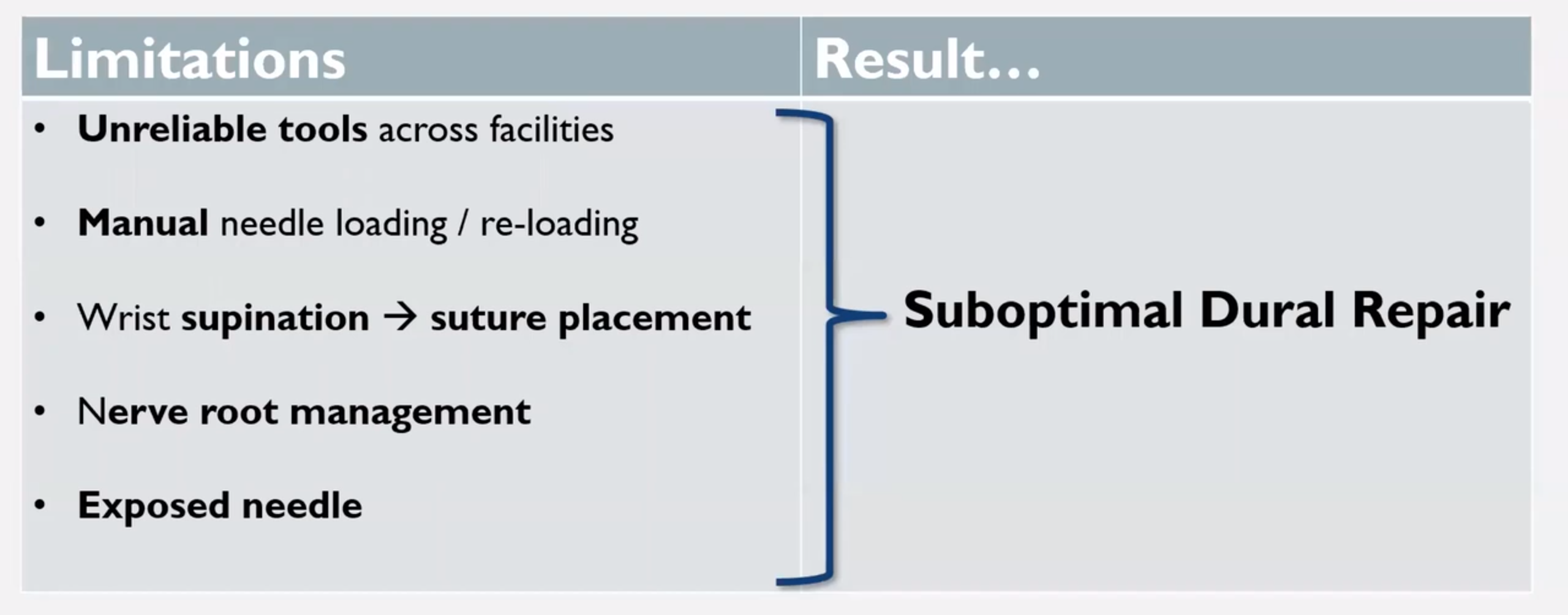 Dural Repair 의 목적은 edges를 맞추고, 바늘 구멍을 줄여주며, nerve root를 보호해야하며 tissue를 손상시키지 않아야 합니다. Suturing 에는 어느정도 한계가 있을 수 있습니다.