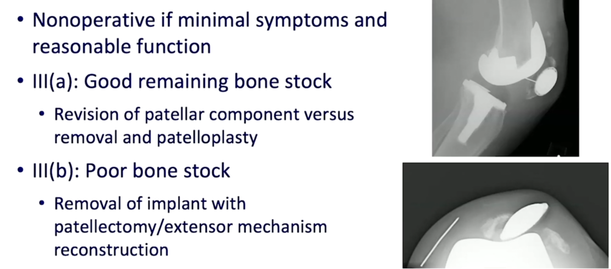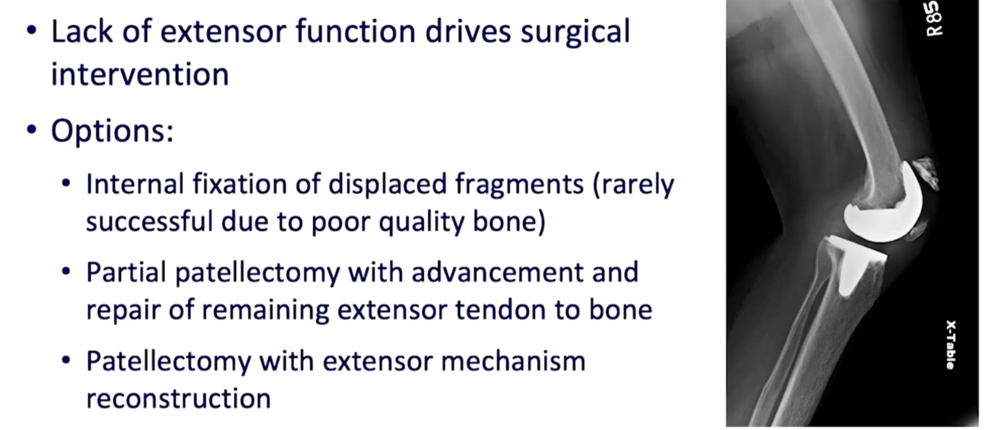 중요한 것은 Type II 인데, 폄근의 기능을 상실하였기 때문에 수술적인 치료가 필요합니다. 안에 들어간 implant는 정상일 수도 있으며, Bone Stock 이 남아있는 정도를 확인하여 수술의 종류를 설정할 수 있습니다. (대게 고령에 뼈 상태가 좋을 수 없으니 Partial patellectomy를 가장 많이 할 것 같습니다.)