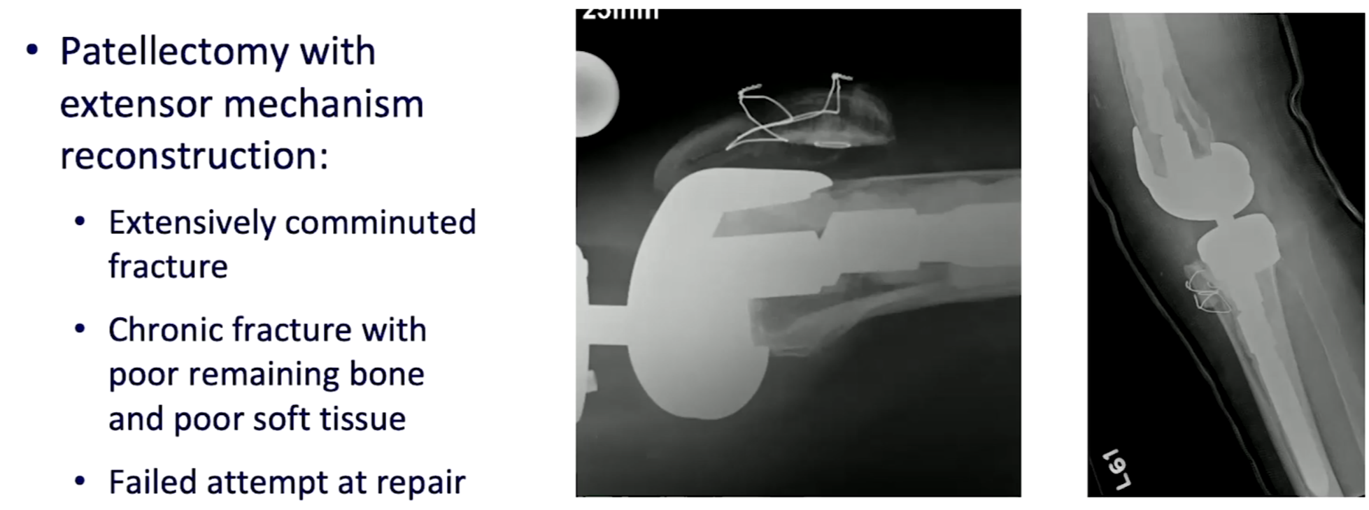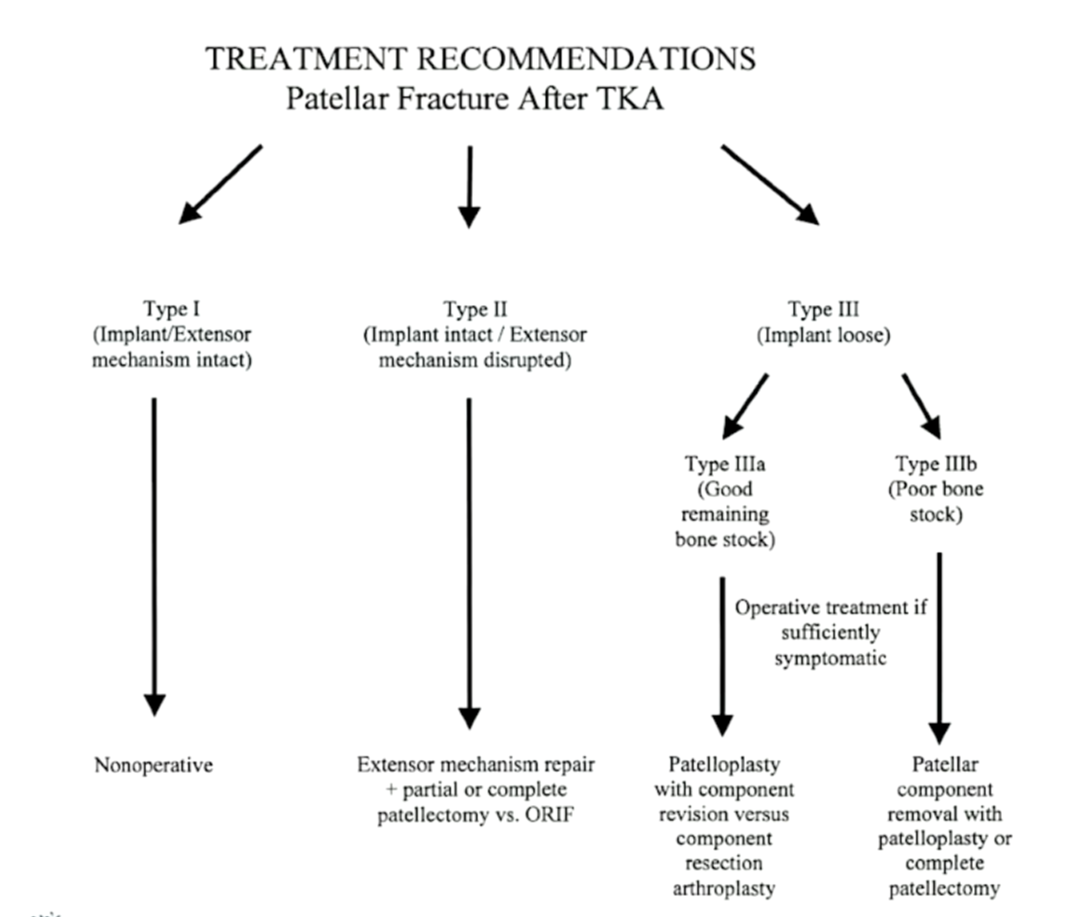 Type I, II, III 로 나뉠 수 있는데 모두 intact한 경우 I, implant는 intact하나 extensor mechanism이 작동하지 않을 때는 II, implant도 loosening 되고, implant 도 풀린 경우에는 III 로 나뉠 수 있습니다.
