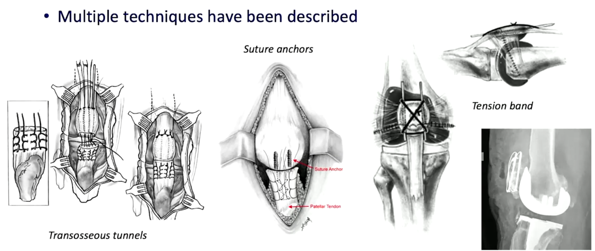 아래와 같은 방식으로 여러가지 수술을 시행해 볼 수 있습니다. (ORIF, 뼈와 근육을 연결한 부위를 채취하여 기존의 patella 부분과 tibia 부분을 연결하도록 꼬매서 폄근육을 재건하는 경우, Suture anchor를 이용해서 repair 하는 경우, K-wire를 이용한 tension band wiring을 시행해 볼 수 있습니다.)