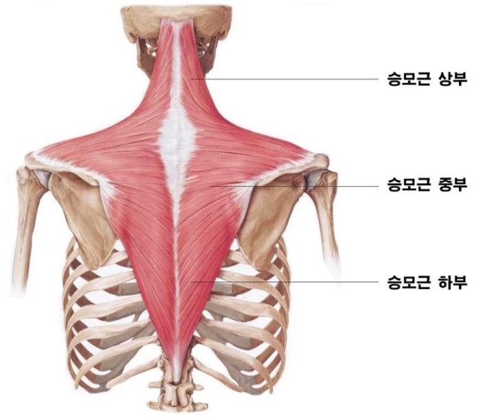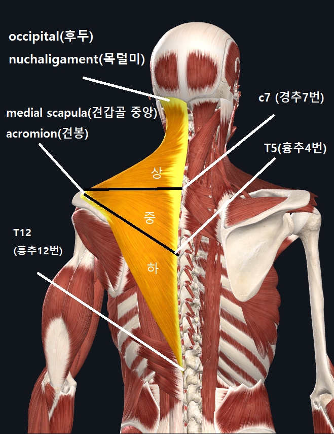일단, 이러한 문제를 해결하기 위해선 목과 등을 구성하는 뼈와, 근육의 모습을 확인해 보아야 합니다. 근육과 인대는 뼈와 뼈를 이어주는 역할을 하게 되는데, 후두부, 경추, 견갑골 이 3개의 뼈를 이어주기 위해 근육들이 상화 작용을 하게 됩니다.