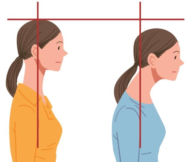 아래와 같이 시상면에서 보았을 때, 정상의 경우 같은 평행선에 놓여야할 경추와 흉추에서 나쁜 자세로 오래 있게 되면 상위 경추가 앞으로 나오게 되면서 경추의 추가적인 하중을 받게 되기 때문에, 경추 디스크나 각종 승모근 문제가 생길 수 있습니다. 최근에는 점점 어린 연령에서 이러한 거북목 증후근 등이 발견되는 경향이 있습니다.