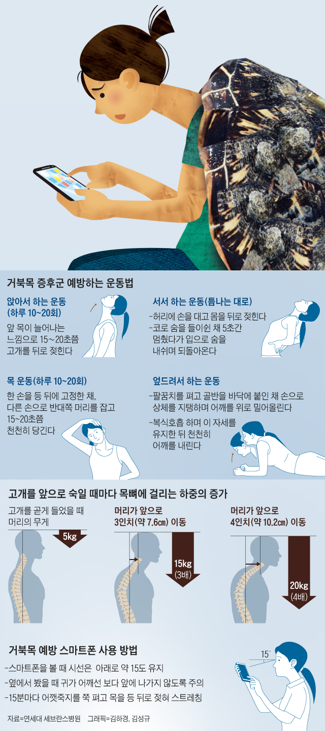 똑같은 자세로 운전을 장시간으로 하거나, 시험 등을 준비하느라 고개를 아래로 숙인 자세로 오랜 시간을 보내게 되거나, 높은 베개를 베고 자거나, 스마트폰의 보급으로 어렸을 때부터 고개를 아래로 내린 상태의 자세를 취하게 되는 경우 등 입니다. 이러한 자세들은 모두 근육의 밸런스를 무너뜨리게 되는 자세 입니다.
