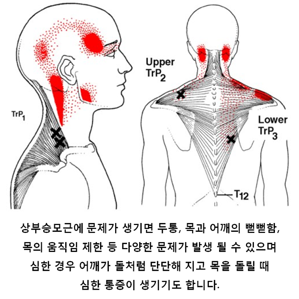 가장 많은 환자분들이 생각하는 목뒤 통증과 어깨 결림, 뭉침은 모두 이러한 근육에서 느끼는 통증 입니다. 상부 승모근이 가장 불편한 자세에서 많이 늘어나야하기 때문에 더욱 잘 뭉치고 아픈 것 같습니다. 쉽게 생각하면, 머리쪽 뼈가 앞으로 나오게 되어 원래 있던 모양의 근육들이 쭉 늘어진 상태로 있다보니 본래의 근육의 역할을 잘 못하게 되는 그런 상황입니다.