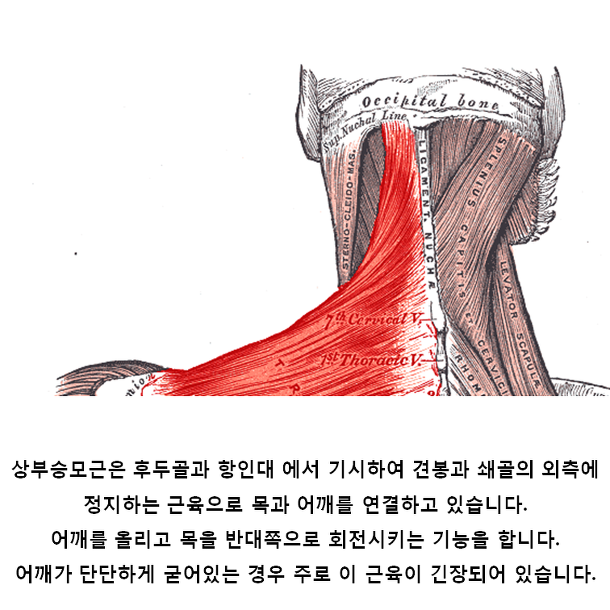 일단, 이러한 문제를 해결하기 위해선 목과 등을 구성하는 뼈와, 근육의 모습을 확인해 보아야 합니다. 근육과 인대는 뼈와 뼈를 이어주는 역할을 하게 되는데, 후두부, 경추, 견갑골 이 3개의 뼈를 이어주기 위해 근육들이 상화 작용을 하게 됩니다.