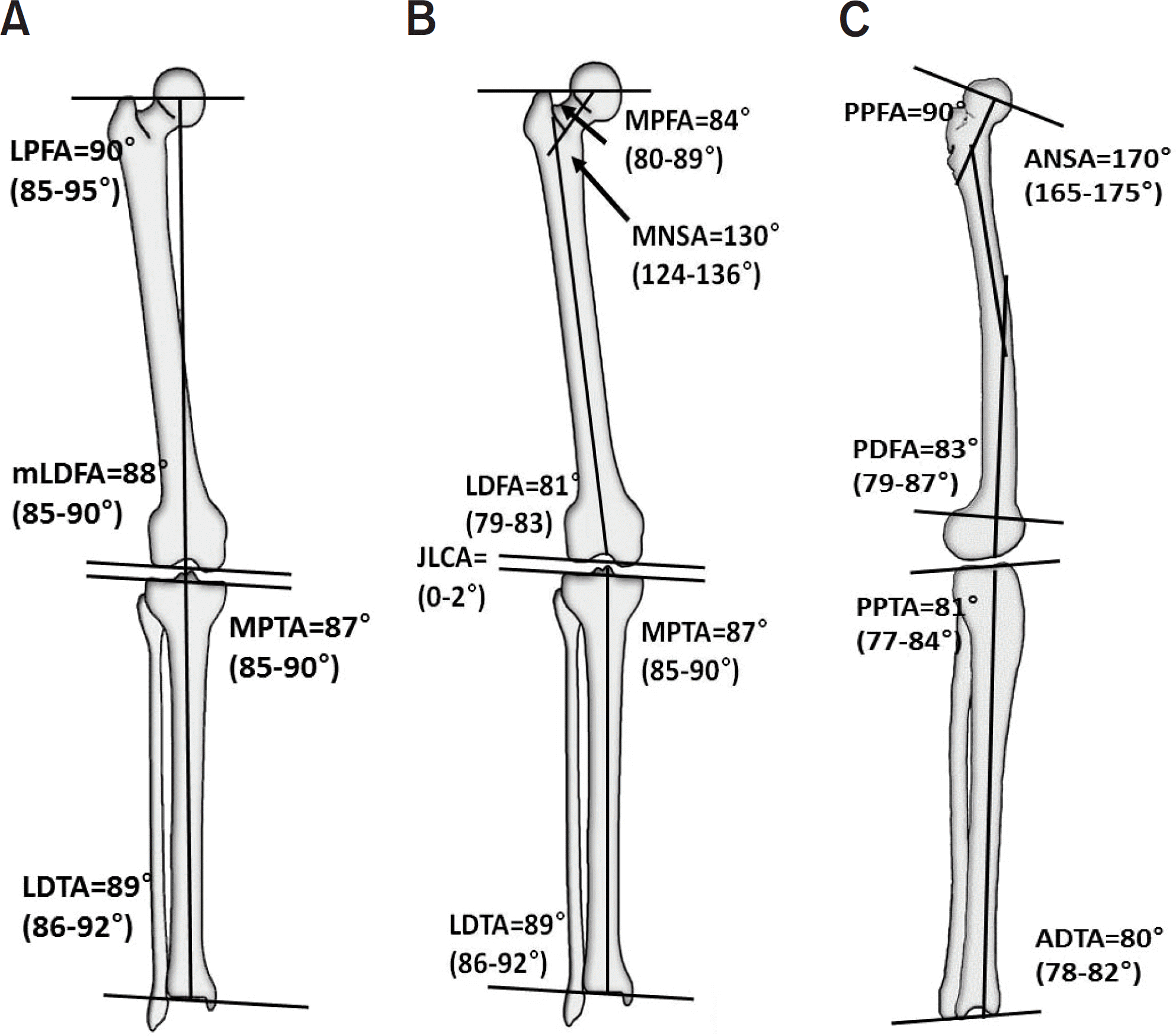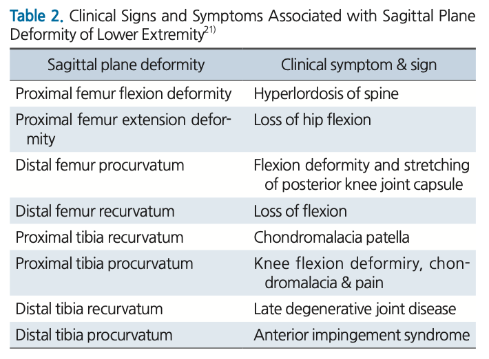 하지의 정렬과 각 변형(deformity)의 경우 LLD(leg length discrepancy), Angulation, Rotation, Translational deformity 등이 있습니다. 변형의 측정이 중요한 이유는 미용적인 원인 외에도 임상적으로 일상생활시 파행(claudication) 및 통증, 조기 관절염과 관련되므로 정확한 측정이 필요합니다.