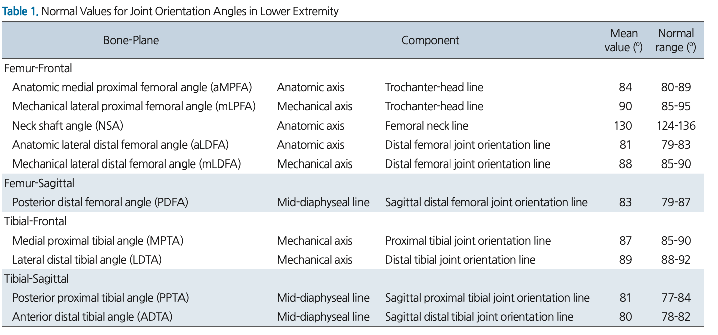 관절선 합체각(Joint Line Convergence Angle, JLCA) 은 한 관절의 두 개의 관절 방향선이 이루는 각도로 0~2도 가 정상입니다.