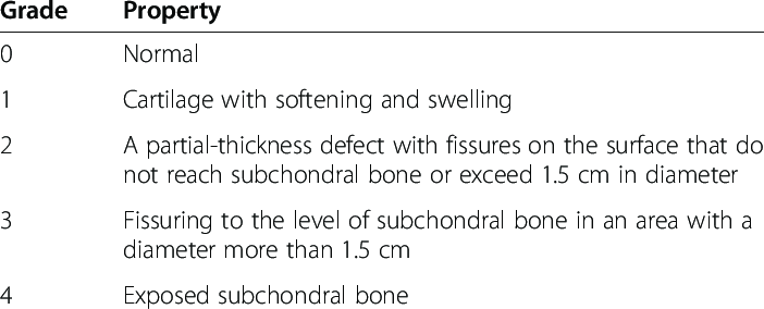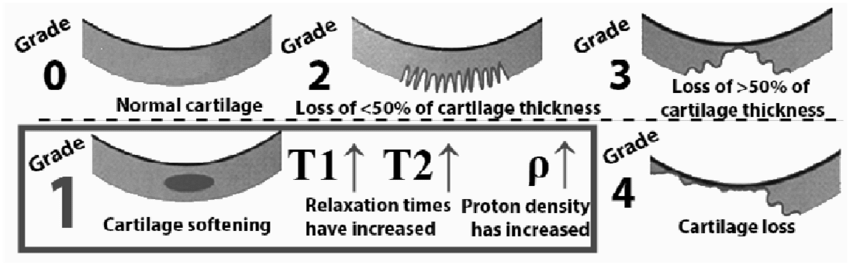 제일 중요한 Grade 입니다. Grade 1 의 경우 softening이나 swelling 정도이며 2부터 Partial, 3은 Fissuring, 4부터는 Subchondral bone 이 노출되었을때 4라고 표현하게 됩니다. K-L grade 와 다르게 좀더 디테일하게 관절의 손상 정도를 표현할 수 있습니다.