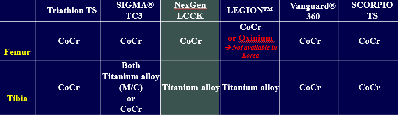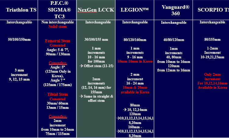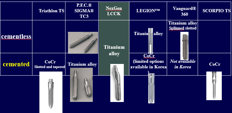 인공관절을 하고나서 합병증이 생기거나 오래되어 재치환술을 하게 되는 경우, 중요한 것은 이런 Revision system을 알고 수술하는 것이다. Stem 별 특징이 있는 데 이 것을 이해해야 수술을 할 수 있다. 애초에 bone defect 가 심해도 이러한 revision system을 이용한 TKR 을 시행해 볼 수도 있다.