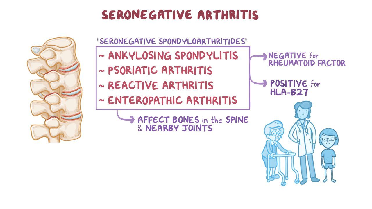 분류에서 쉽게 생각하면 염증성 관절염에서 Seronegative한 관절염에는 강직성 척추염, 건선 관절염, 반응성 관절염, 염증성 장질환 등이 해당된다고 보면 이해가 쉽게 될 것 같습니다. 류마티스 관절염의 진단 역시 혈청에서 나오는 RA factor 외에도 Anti-CCP 와 다른 관절 침범 정도, 침범 기간으로 점수화 하여 진단하기 때문에, 점수가 10점만점 6점이상이 나오게 된다면 Seronegative Rheumatoid Arthritis 로 진단할 수 있습니다. ( 관절 MRI 촬영으로 관절 활막이 침범되어 있는 지 확인하는 것도 중요 합니다. )