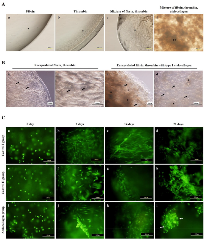 콜라겐은 이용한 연구도 지속적으로 진행중입니다. Type 1 콜라겐의 집약체인 atelocollagen 등을 실험적으로 사용하고 있습니다. 이러한 atelocollagen과 thrombin이 섞여있는 용액과 fibrinogen을 섞어서 주입하는 방식이 ACIC 입니다.