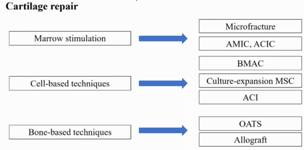 Cartilage Repair는 Microfracture(Bone Marrow Stimulation), Osteochondral Transfer(OATs, femoral trochlear의 medial lateral margin, 혹은 intercondylar notch 를 이용하므로 hyaline cartilage를 붙이게 됨), 그리고 Chondrocyte implantation(ACI) 으로 정리할 수 있습니다.