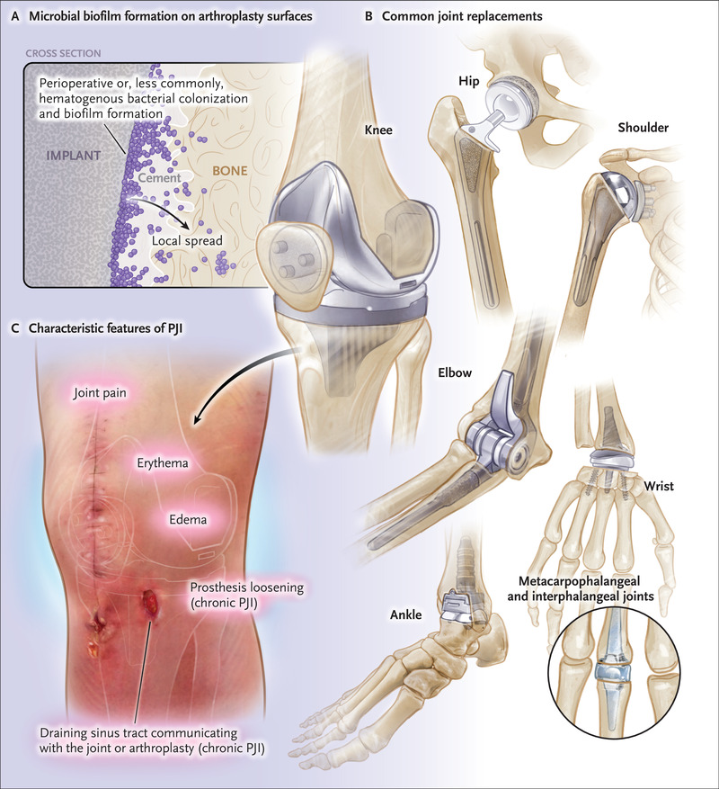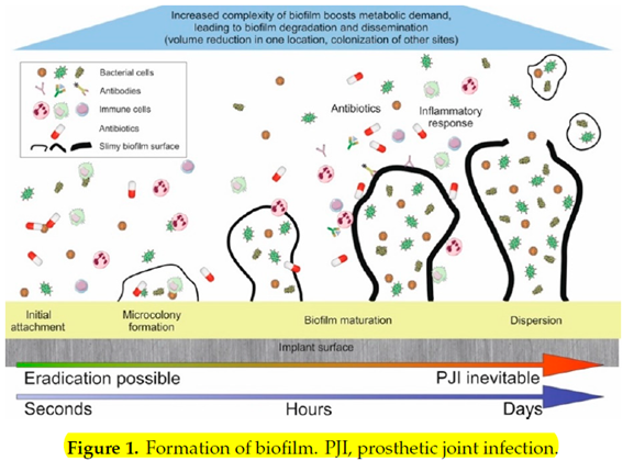 감염이야 수술에서 안생기는 것이 무엇보다 가장 중요하지만, 여러가지 원인에 의해 생길 수 있습니다. 박테리아가 혈관에서 넘어올 수도 있고 수술 중 들어갈 수도 있는데 host의 면역이 약한 경우는 이런 박테리아가 군집을 이루게 됩니다. 군집을 이루게 되면 biofilm을 형성하게 되고 이는 항생제나 면역시스템에 저항성을 갖게 됩니다.