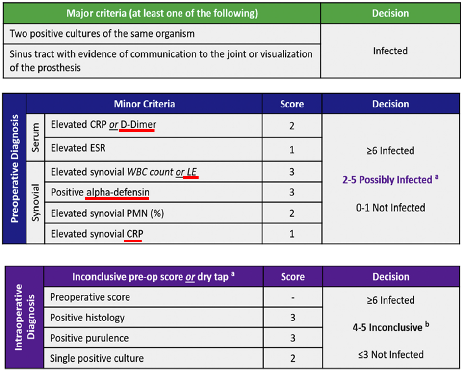 PJI 분류는 여러가지를 사용할 수 있는데 대게 3개월 기준으로 early, 1년 기준의로 delayed, late를 나눌 수 있습니다. PJI는 단독으로 판단하기 보다는 여러가지 지표들을 통하여 결정하게 되는 데 : 임상적 판단, serologic testing, synovial fluid aspiration, radiologic assessment, micribiologic & histopathologic testing 등을 통해 판단할 수 있습니다.