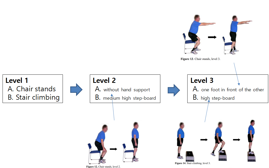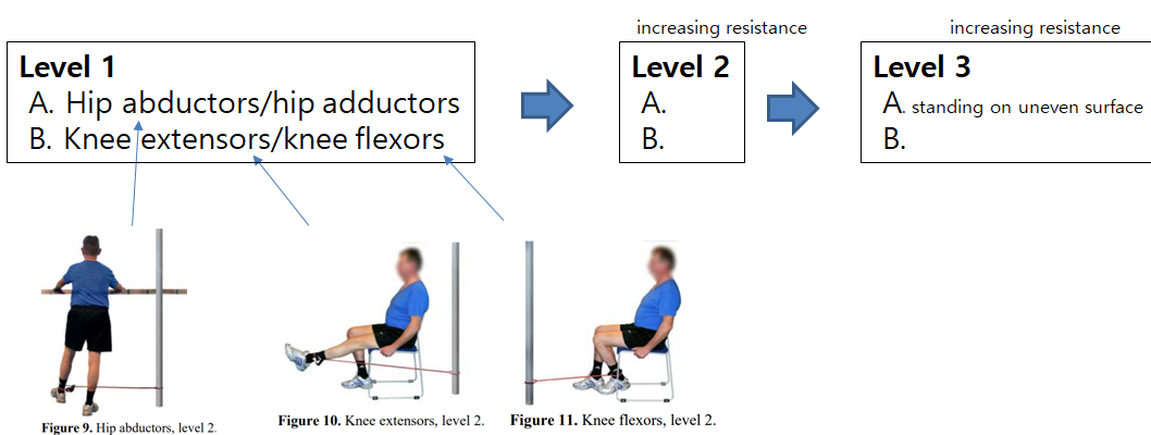 - core stbaility/postural function, postural orientation, lower extremity muscle strength, functional excercise 로 구성되어 있습니다.