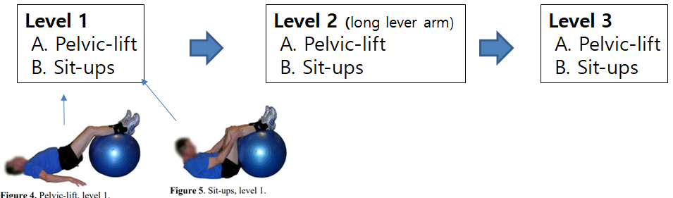 core stability/postural function은 짐볼에 다리를 올려놓고 고관절을 들거나 굽히면서 하게 됩니다.