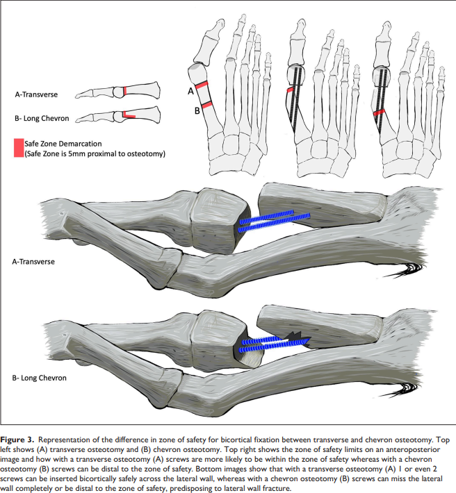 수술방법과 사진은 동일한데 절골면이 transverse 합니다. 이렇게 transverse 하게 되면 쉬울 뿐더러, 절골면이 전반적으로 근위부의 cortical bone 면적이 넓어져 cortex가 유지가 잘 되어 유리한 측면이 있습니다. IMA(Intermetatarsal angle) 교정을 매우 빠르게 가져올 수 있습니다.
