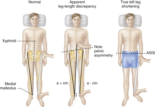 줄자를 이용해서 ASIS에서 부터 진성길이를 측정하는 SMD(spine malleolar distance)나 현성길이 UMD(umbilicus maleollar distance) 를 측정할 수 있습니다. 현성길이는 골반경사가 존재할 경우, 정확도가 감소하므로 신뢰성이 떨어집니다. 하지의 회전변형, 각 변형, 족부의 크기와 높이차이, 척추 측만, 골반 경사, 관절 구추, 관절 운동성의 감소 유무, 근력 약화, 마비 등도 관찰하도록 해야합니다.