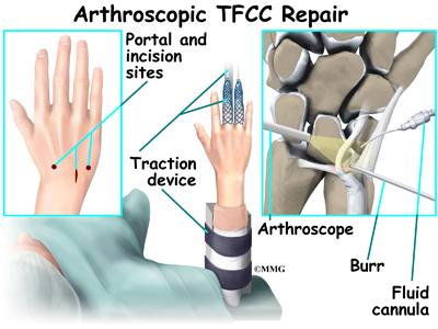 중심부파열(1A의 경우)은 원위 요척관절의 불안정성을 일으키지 않으므로, 고정과 항염증 약물 등의 보존적 방법으로 치료가 가능하지만, 파열 부위가 계속적인 통증을 일으킬 경우는 관절경적 변연절제술 을 시행할 수 있습니다.