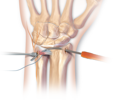 척수근 감입증후군의 치료로는 척골변이가 중립이면 관절경으로 관절판, 관절면의 연골 및 월상삼각인대 등의 파열된 부위를 변연절제술을 시행하지만,대부분 척골 변이가 양성이므로 척골 가분에서 척골 단축술(ulnar shortening)을 시행하거나 척골두에서 수근골과의 관절면을 일부 절제하는 Wafer 술식으로 척골두와 수근골 간의 압력을 낮출 수 있습니다. 척골 단축술은 척수근관절 자체에 수술적 외상을 주지 않고 단축술에 따라 척수근골인대가 신연되면서 원위 요척관절의 안정성도 좋아지는 장점이 있지만 절골술의 불유합이 발생할 수 있거나, 이차적으로 금속판 제거가 필요할 수 있습니다.