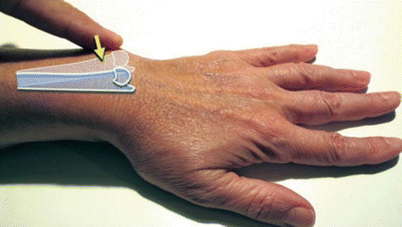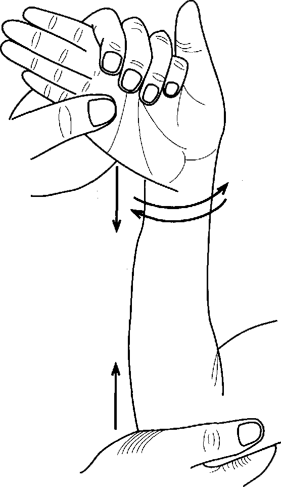 환자의 전완부를 탁자 위에 세우고 환자의 손을 잡고 수근관절에 압력을 가한 상태에서 굴곡-신전 및 척측-요측 변위로 수동적으로 움직일 때 통증 유무를 관찰합니다.