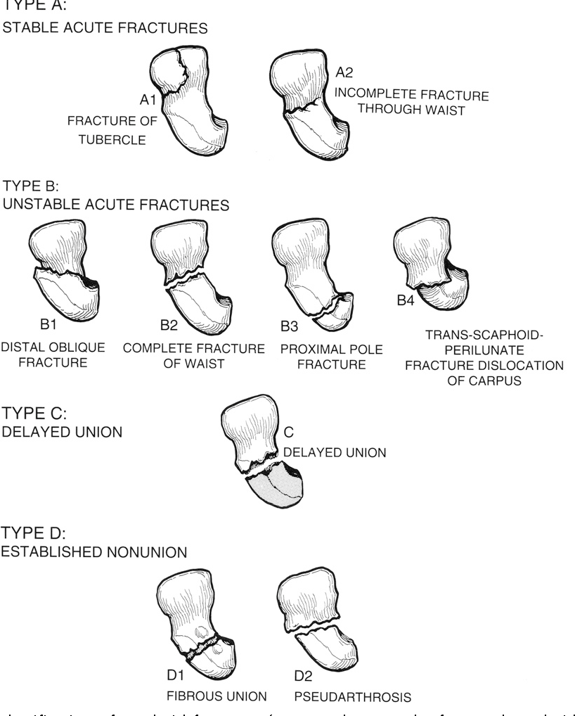 Herbert A의 경우 경과관찰(캐스트, 롱암썸스피카) 을 하여도 유합되는 경우가 많지만 근위 첨부의 골절의 경우 전위 유무와 상관없이 불안전성으로 간주하고 후방도달법을 이용해 수술적 치료를 하여야 합니다.