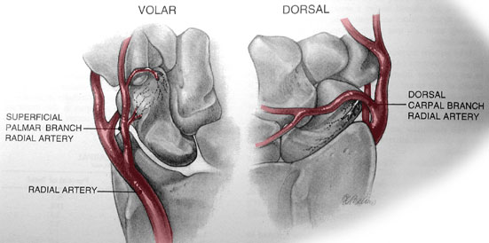 후방부 쪽으로는 Dorsal carpal br. of radial a. 가 70~80% 혈류를 공급합니다.