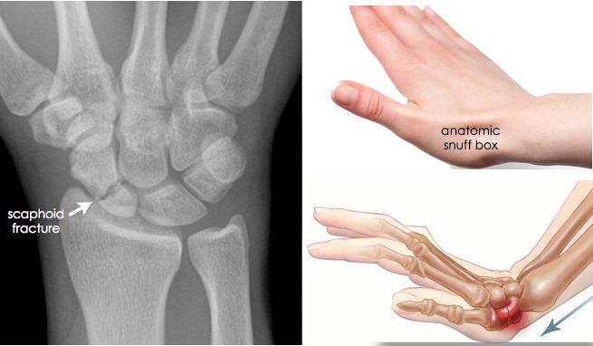 진단은 Anatomical Snuff Box 라고 불리는 부위에 통증이 있으며 주상골을 눌러보았을 때 통증이 있는 경우 임상적으로 진단이 가능하며, 초기 방사선 사진에서는 골절이 보이지 않더라도 반드시 2주 뒤 2차 방사선 사진을 촬영하여야 합니다. MRI 에서 모호한 골절의 경우 2.8일이 경과한 후에 가돌리늄을 이용해 증강시켜 골절을 확인할 수 있습니다. (혈류량을 확인해 볼 수도 있습니다)