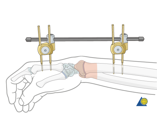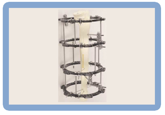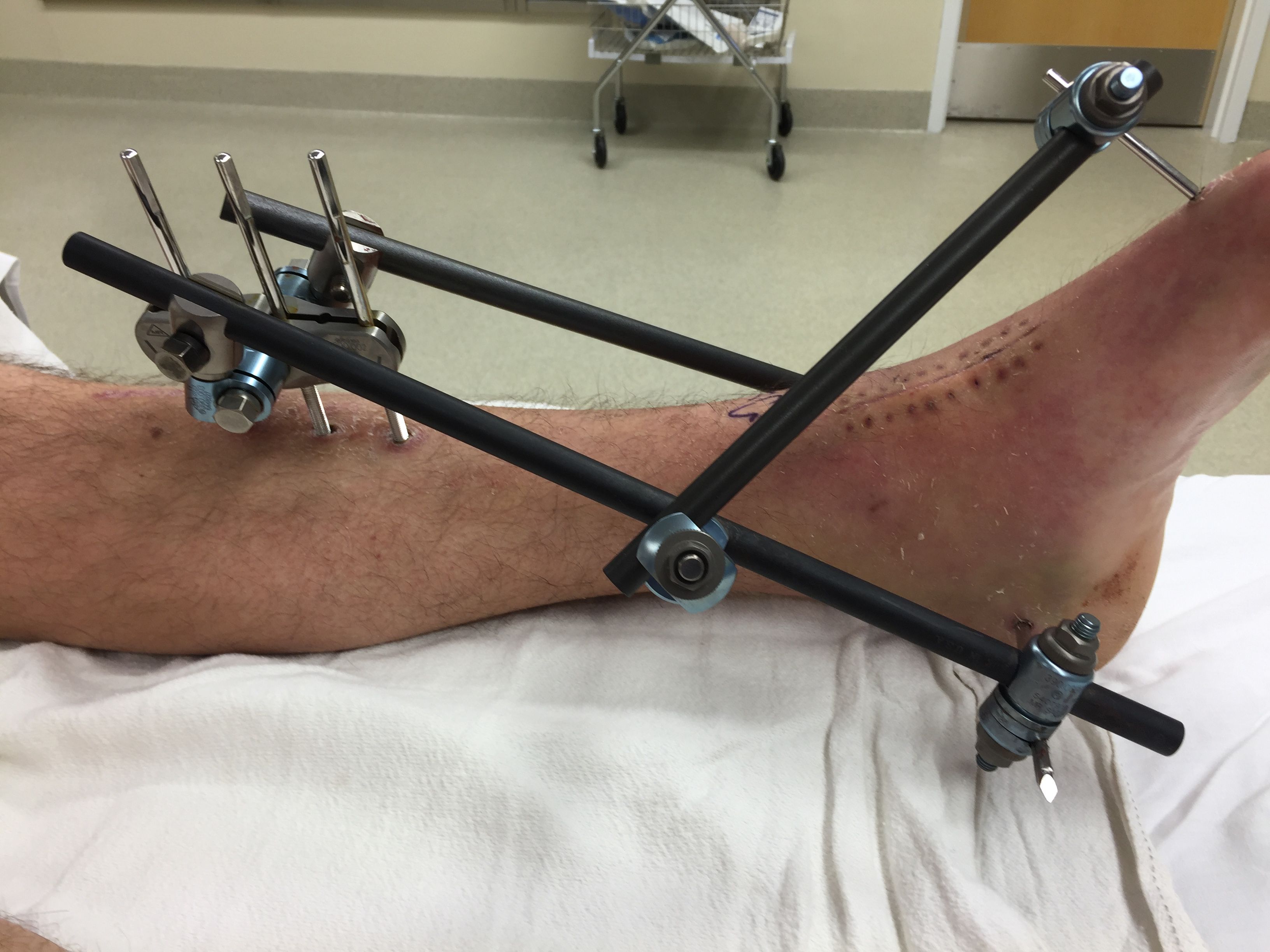 심한 골절 환자나, 특정 골절 환자들은 바깥에서 고정을 하는 '외고정기(EF: external fixator) 를 사용해서 뼈를 고정하기도 합니다. 밖에서 뼈를 고정하기 때문에 핀 부위의 감염의 가능성은 높아지지만 피부를 크게 절개할 필요가 없으며 수술시간이 매우 짧기 때문에, 족부나 특정 분야에서는 많이 사용되고 있습니다.